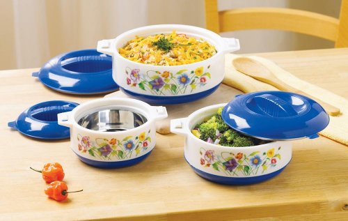 6pc Thermo Serving Set: Lock in the flavor and temperature of your favorite foods with this insulated hot-and-cold thermo storage bowl set. Set of 3 bowls, in 12- oz., 24- oz. and 36-oz. sizes, comes with lock-tight lids, making them the perfect way to transport and store your signature recipes. Durable plastic bowls feature spring flower design with blue easy-grip lids with thermal lining within. Hand wash....