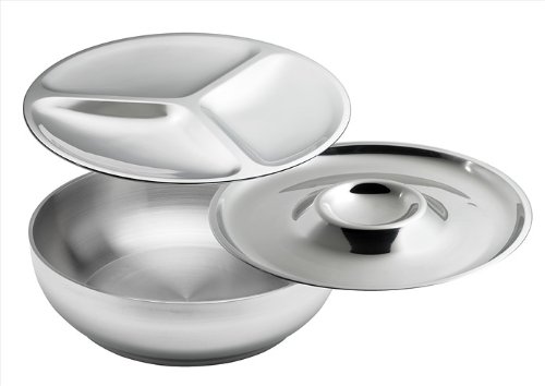 Perfect for the buffet, cocktail parties, picnics, or BBQs, this Kraftware Sleek 3-piece entertaining set features a 19-inch round base bowl in double wall insulated stainless steel with a polished finish. Fill this base bowl with ice, then set the 3-section tray on the top to create a chilled appetizer tray, or use the chip and dip section instead. This great entertaining set is perfect for serving veggies, fruits, assorted cheeses, chips and dips. Each piece may also be used alone; the bowl for salads, and the 3-section plate- or the chip and dip section- for appetizers that don't need to be chilled. The polished stainless steel gives this set a stylish, classy elegance that can be dressed up on a formal buffet, or used for a casual affair.